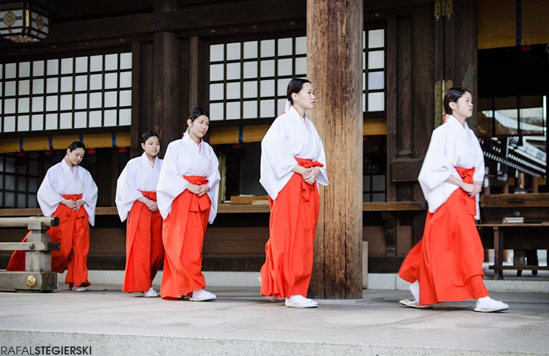 Trudno o dziwniejsze sąsiedztwo, ale właśnie dwa kroki od Harajuku znajduje się Meiji Jingū (明治神宮). Świątynia Shinto poświęcona cesarzowi, który był odpowiedzialny za zmiany mające miejsce po połowie dziewiętnastego wieku i doprowadziły do otwarcia Japonii na Świat, i jego małżonce cesarzowej Shoken. Kompleks leśny składający się ze stu dwudziestu tysięcy drzew i zajmujący ponad siedemdziesiąt hektarów otacza budynki świątynne odbudowane w 1958 roku. Wędrując ścieżkami mamy szansę odpocząć od gwaru Tokio i, między innymi, napotkać Miko (oczywiście są one obecne też w innych, przynajmniej tych większych, świątyniach). Ich rolą jest zajmowanie się świętym miejscem, ale błędem byłoby traktowanie ich jako zwykłej obsługi, czy wręcz, sprzątaczek. Ubrane w czerwone spodnie (hakama) i białe koszule (haori) wśród zadań mają dokonywanie ceremonii oczyszczenia, podobnie jak czynią to Kannushi (kapłani), oraz podczas specjalnych okazji wykonują tradycyjny taniec Kagura. Dawniej szamanka i wieszczka, obecnie, w wyniku sekularyzacji Japonii, niezamężna uczennica lub studentka, która w ten sposób dba o zachowanie tradycji, przy okazji dorabiając parę jenów do kieszonkowego.